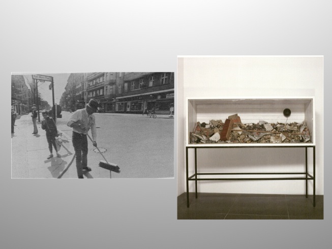 In his performance “Ausfegen,” literally sweeping clean, he and two students used a red broom to clean up the debris left over from a left-wing May-Day demonstration on the Karl Marx Platz in East Berlin, demonstrating thereby that his critique is directed as much at the Soviet controlled east as the capitalist West. [67]