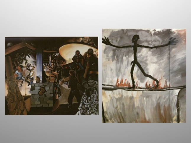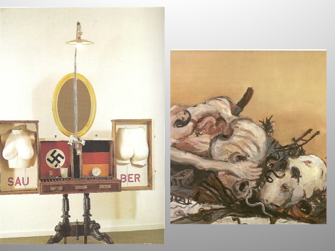 The title of Georg Baselitz’s “Bild für die Vaeter” (painting for the fathers) 1965, clearly denounces those he views as responsible for the war. The decomposing bodily mass speaks of physical as well as moral violence in its use of figuration in an almost abstract aggressive application of paint. While his work shows the effect of the paintings by de Kooning, Pollock, Rothko and Guston that Baselitz had seen at an exhibition of New American painting in 1958, it purposefully straddles the demarcation between abstraction and figuration. [73]