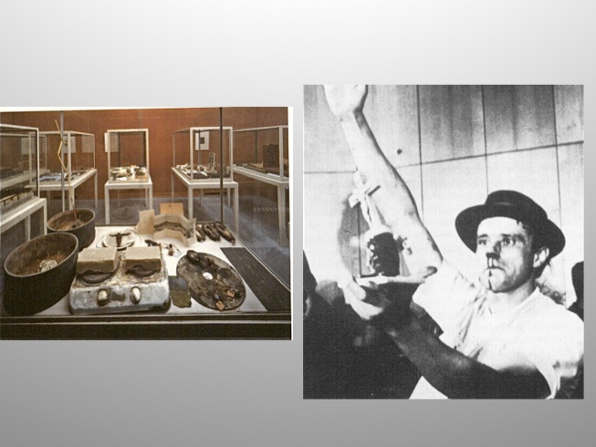 Beuys was also the first German artist to try to deal with the commemoration of the Holocaust. His sculpture “Auschwitz Demonstration” belongs to what he called his “social sculptures”. In a vitrine, resembling a medical cabinet, he positioned two blocs of fat on top of a cooker, which is not plugged in and is therefore unable to provide the necessary heat to warm the fat and depriving it of its malleability.