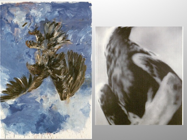 With their paintings “Eagle” both Baselitz (on the left) and Gerhard Richter (right) took a motif that was tied to feelings of German nationalism since the 19th century. Baselitz, by painting the motif upside down, a habit he had adopted in 1969, neutralizes its symbolic content, similar to the technique of alienation that Brecht employed in the theater. [75] Richter achieved a similar distancing through the blurred effect of his paintings.