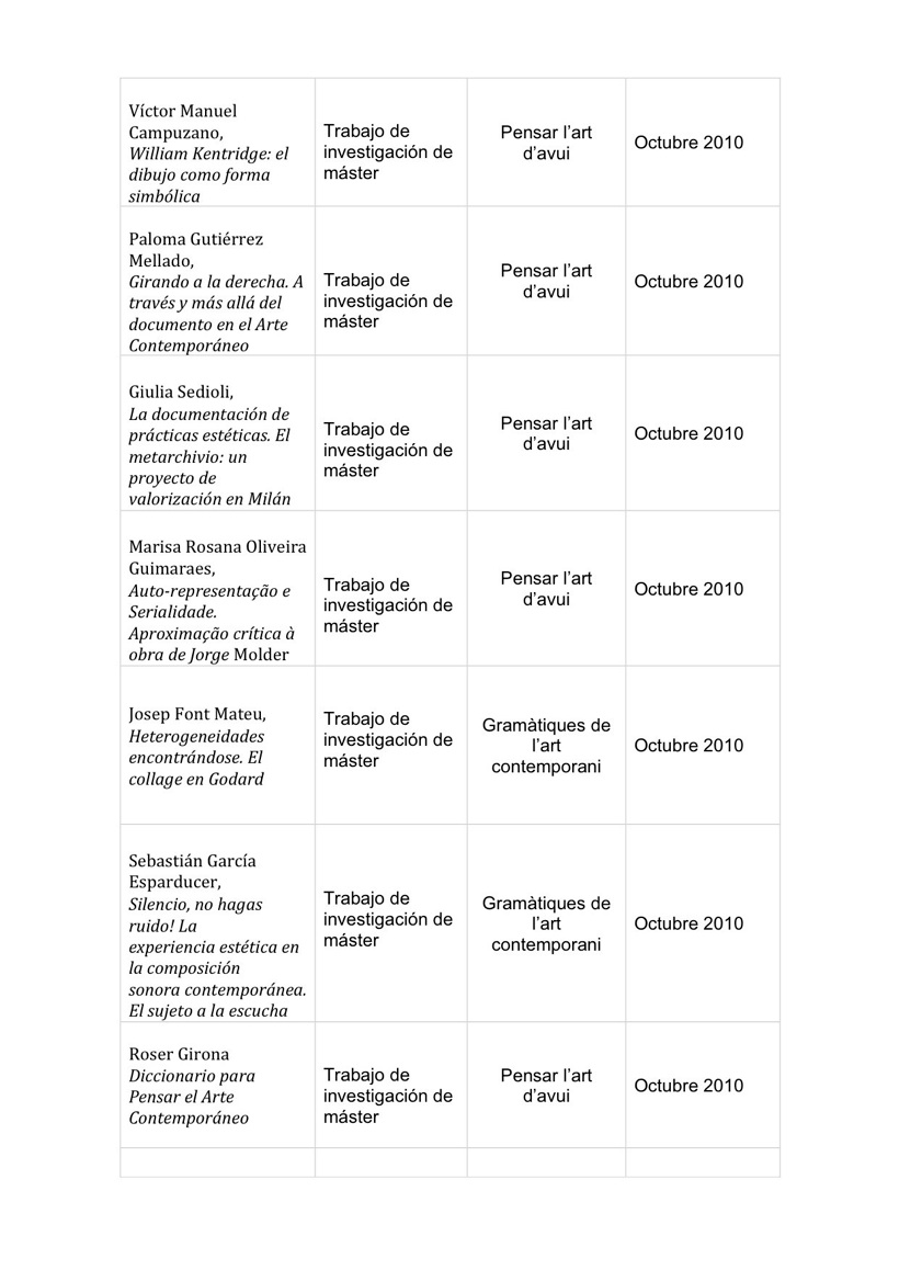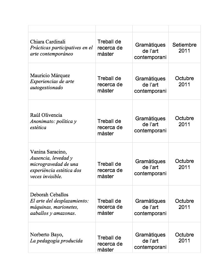 Marcela Prado (becaria CONACYT): Estética relacional. La experiencia estética de participación. Fecha de lectura: 23/09/2011. Calificación: Sobresaliente .